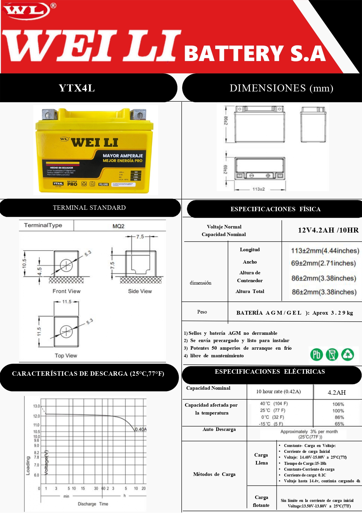 BATERIA PRO AGM/GEL PARA MOTO YTX4L  (12V 4.2AH) POLO (- +) PRECIO NORMAL $15.54